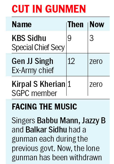 Additional Chief Secretary (Social Security and Development of Women and Children) SK Sandhu, Special Chief Secretary Sarvesh Kaushal and IAS officer KJS Cheema had seven gunmen each. They are left with three gunmen each. All three held important portfolios in the last government.