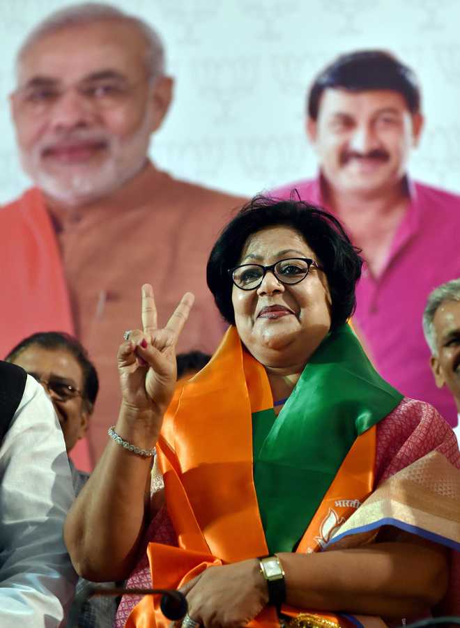 Former DCW chairperson and expelled Congress leader Barkha Singh Shukla making a victory sign after joining BJP in New Delhi on Saturday. PTI