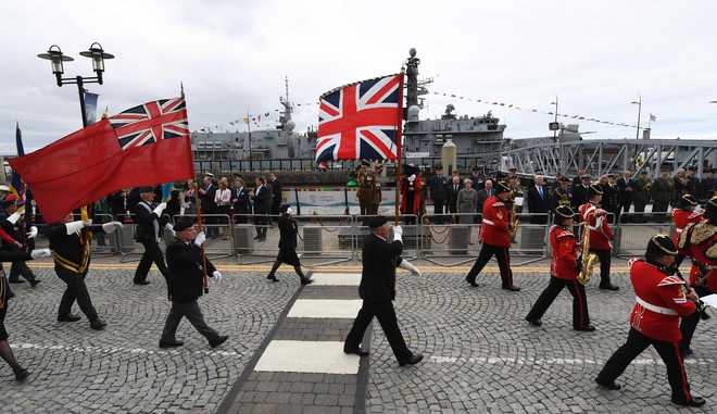 Britain''s Prince Edward, Earl of Wessex (C) and PM Theresa May (3R) watch a parade of military personnel in front of the Royal Navy’s type-23 frigate, HMS Iron Duke to mark Armed Forces Day in Liverpool, northern England on June 24, 2017. — AFP
